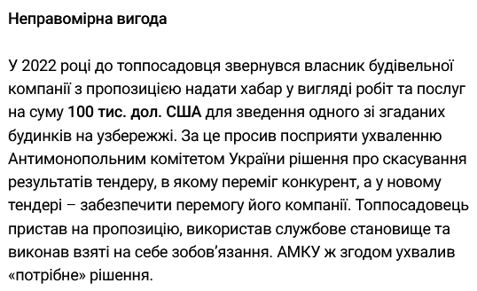 Этого же кейса касается и подозрение по взятке. По версии следствия, в 2022 году к замглаве ОП обратился владелец строительной компании с предложением предоставить взятку в виде работ и услуг на сумму 100 тыс. долларов для строительства одного из упомянутых домов на побережье. За это он попросил оказать содействие принятию Антимонопольным комитетом (АМКУ) решения об отмене результатов тендера, в котором победил конкурент, а в новом тендере обеспечить победу его компании. Смирнов, как сообщается, предложение принял и договорился о "нужном" решении АМКУ.