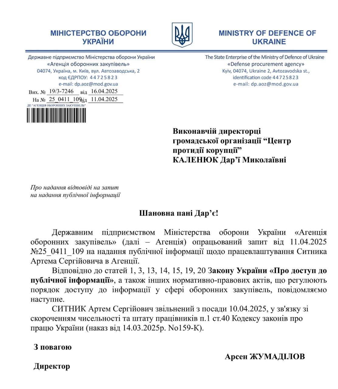 "Сытник Артем Сергеевич уволен с должности 10.04.2025 в связи с сокращением численности и штата работников п. 1 ст. 40 Кодекса законов о труде Украины (приказ от 14.03.2025 г. No159-К)", – отметил Жумадилов в ответе.