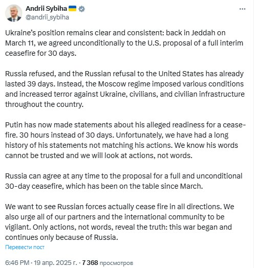 "Позиция Украины остается четкой и последовательной: еще в Джидде 11 марта мы безоговорочно согласились с предложением США о полном временном прекращении огня на 30 дней. Россия отказалась, и этот российский отказ Соединенным Штатам продолжается уже 39 дней. Россия в любой момент может согласиться на предложение о полном и безусловном прекращении огня сроком на 30 суток, которое уже с марта на столе. Мы хотим увидеть, как российские силы действительно прекратят огонь по всем направлениям", – заявил глава МИД Андрей Сибига.