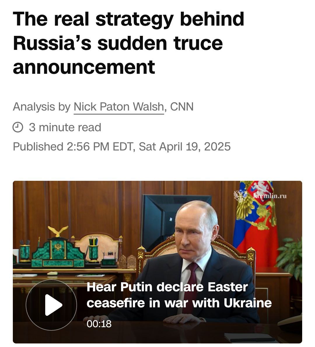 Объявление пасхального перемирия Россией "может вызвать сложности для Украины". Об этом пишет CNN.