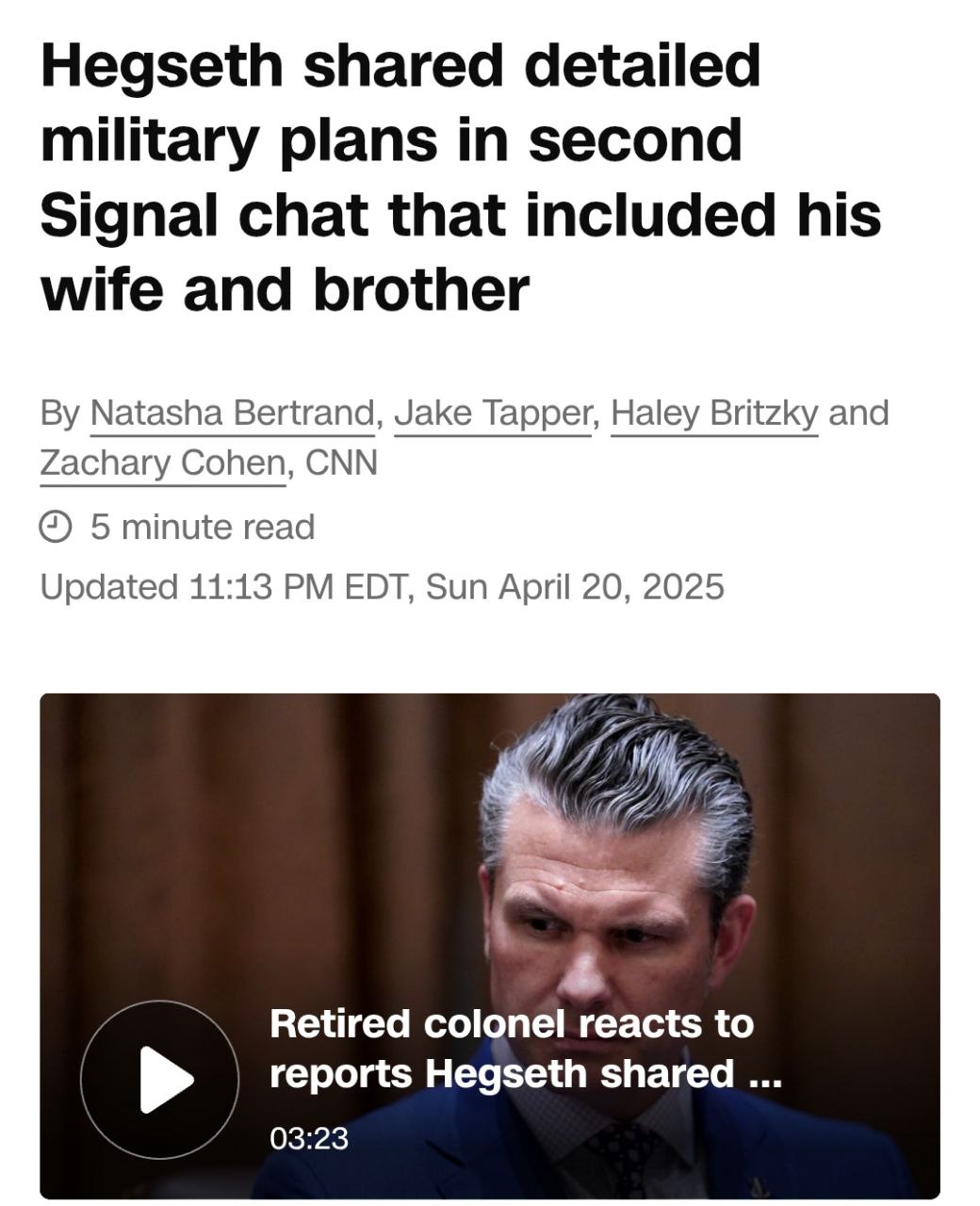 Параллельно CNN пишет о том, что у министра обороны США Пита Хегсета нашли ещё один чат в мессенджере Signal, где он обсуждал детали ударов по йеменским хуситам, и куда имели доступ родственники главы Пентагона - в частности, его жена и брат.
