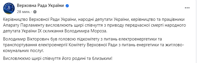 "Руководство Верховной Рады Украины, народные депутаты Украины, руководство и работники Аппарата Парламента выражают искренние соболезнования по поводу преждевременной смерти народного депутата Украины IX созыва Владимира Мороза", - сказано в публикации парламента.