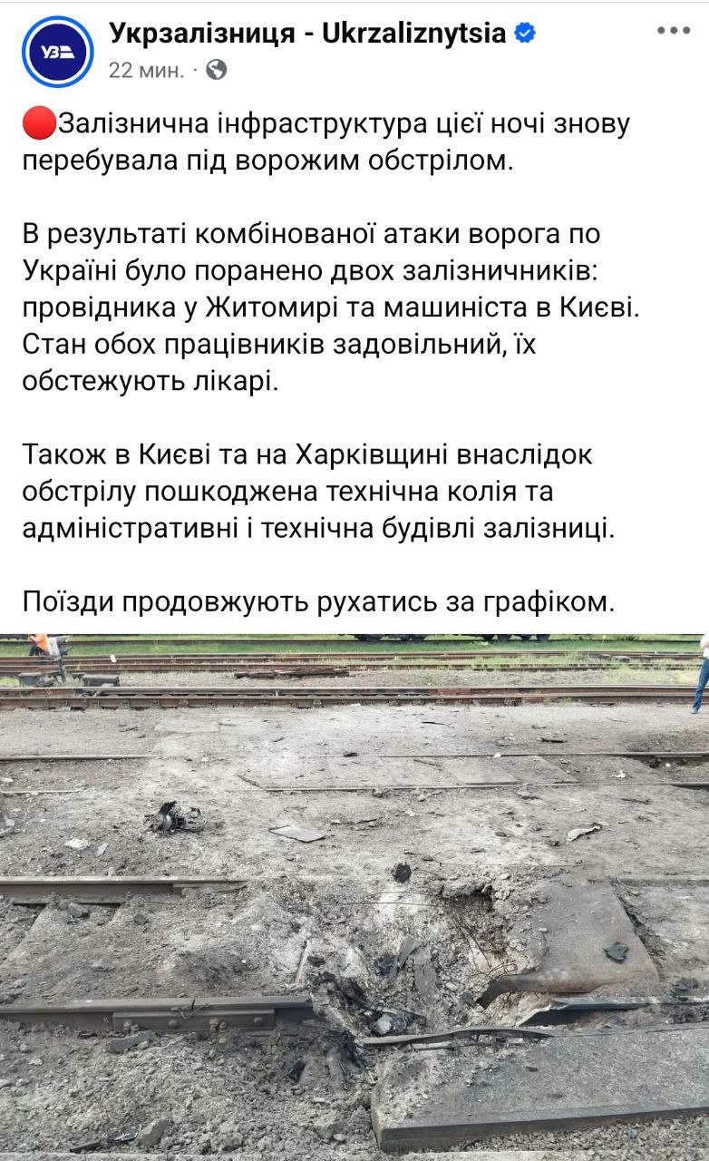 В результате комбинированной атаки врага по Украине были ранены два железнодорожника: проводник в Житомире и машинист в Киеве. Состояние обоих работников удовлетворительное, их обследуют врачи.