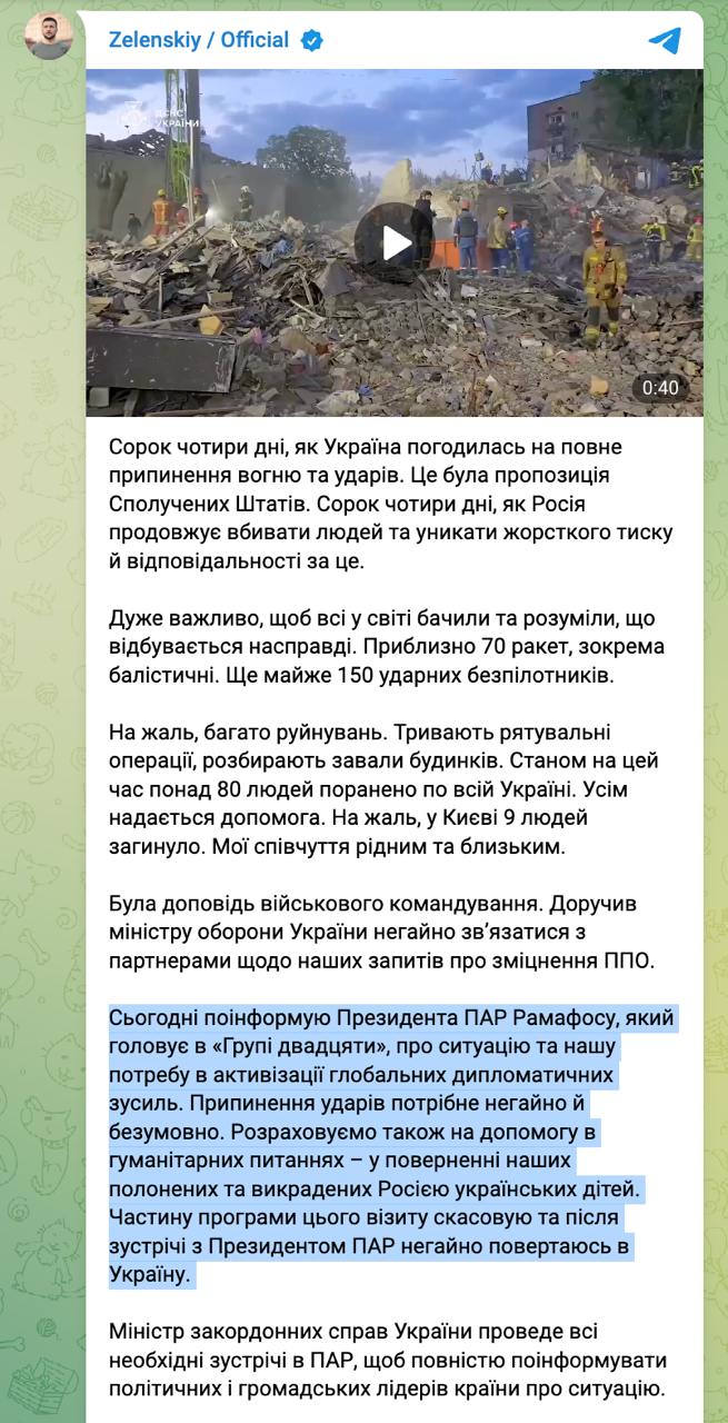 "Сегодня проинформирую Президента ЮАР Рамафосу, который председательствует в "Группе двадцати", о ситуации и нашей потребности в активизации глобальных дипломатических усилий. Прекращение ударов требуется немедленно и безусловно. Часть программы этого визита отменяю и после встречи с Президентом ЮАР немедленно возвращаюсь в Украину", - написал Зеленский.