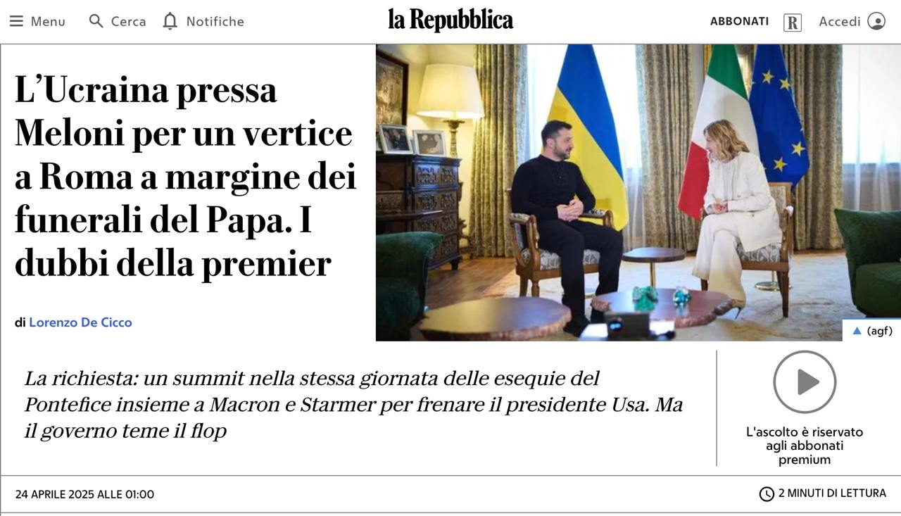 15:05 Украина предлагает провести саммит в Риме в день похорон папы римского, на которые съедутся многие мировые лидеры, включая Трампа, сообщает Le Repubblica со ссылкой на источники.
