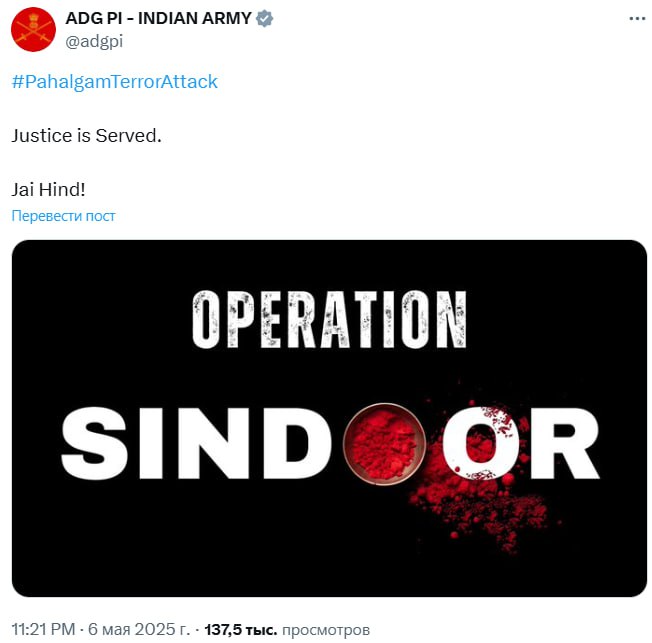 Армия Индии в своем аккаунте в соцсети Х сообщает о начале операции "Синдур".