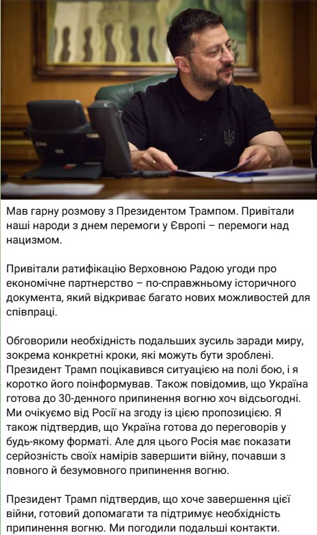 "Нужно, чтобы россияне поддержали прекращение огня. Они должны доказать свою готовность завершать войну. Тридцать дней, которые могут стать началом лет мира. Само прекращение огня, продолжительное и надежное, будет реальным показателем движения к миру. Америка может с этим помочь. Мир нуждается в Америке так же, как и 80 лет назад", - заявил Зеленский, имея в виду, вероятно, недавние заявления Трампа о том, что США внесли решающий вклад в победу во Второй мировой войне.