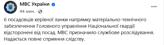 "Шесть должностных лиц руководящего звена направления материально-технического обеспечения Главного управления Национальной гвардии отстранены от должностей. МВД назначило служебное расследование. Оказывается полное содействие следствию", - говорится в сообщении.