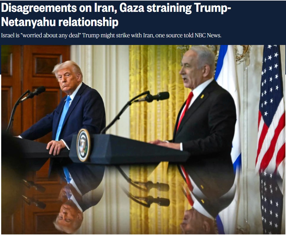 По данным издания, на прошлой неделе израильский министр Рон Дермер передал разочарование премьер-министра в связи с заявлением Трампа о том, что пока не решено, сможет ли Иран обогащать уран в будущем, в то время как Трамп разочарован решением Нетаньяху возобновить войну в Газе, что, по-видимому, противоречит плану Трампа по восстановлению сектора Газа.