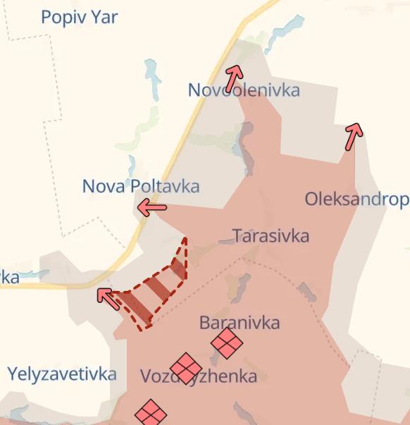 Продвижения есть на Новопавловском направлении южнее Серебряного, а также к югу от Константиновки - в районе Водяного 2-го. В итоге уже в нескольких местах идут бои на трассе Покровск - Константиновка.