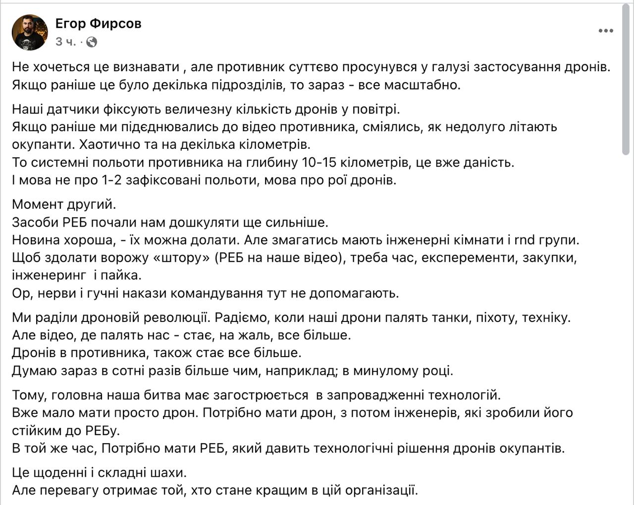 Также РФ развивается в использовании РЭБ, заглушая украинские дроны. Поэтому Фирсов призывает государство системно подойти к внедрению технологий и к поддержке работы украинских инженеров.