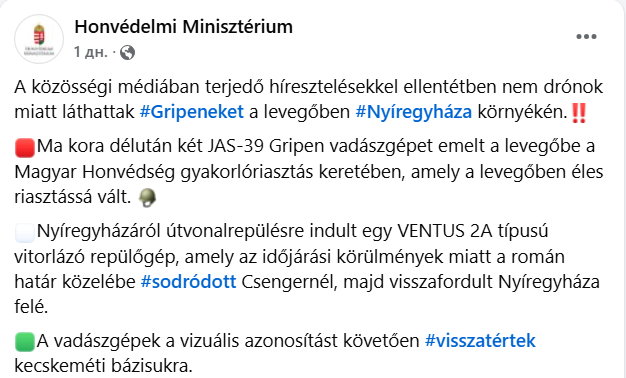 "Несмотря на слухи, Gripen были замечены в воздухе возле Ньиредьхазы не из-за беспилотников. Силы обороны Венгрии подняли в воздух два истребителя JAS-39 Gripen в рамках обучающей тревоги, которая в воздухе превратилась в боевую. Планер Ventus 2A вылетел из Ньиредьгазы по маршруту, но из-за погодных условий его отнесло близко к румынской границе, а затем он развернулся назад в сторону Ньиредьхазы", - заявили в Минобороны.