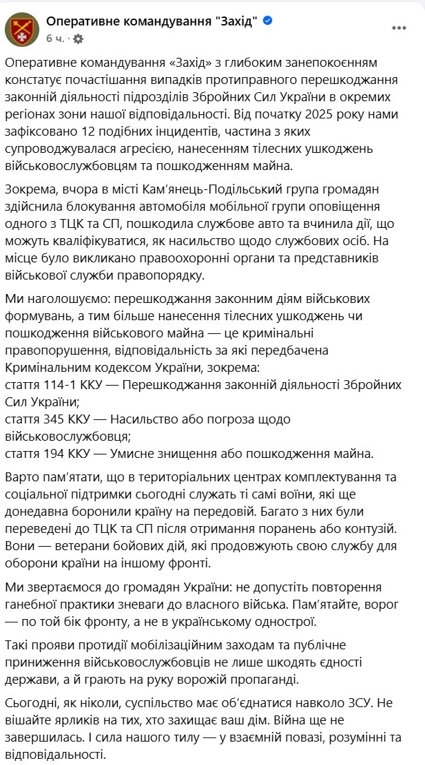 Оперативное командование "Запад" выразило обеспокоенность ростом таких случаев. По их информации, с начала 2025 года зафиксировано 12 подобных инцидентов, часть из которых сопровождалась применением насилия к военнослужащим и порчей имущества.
