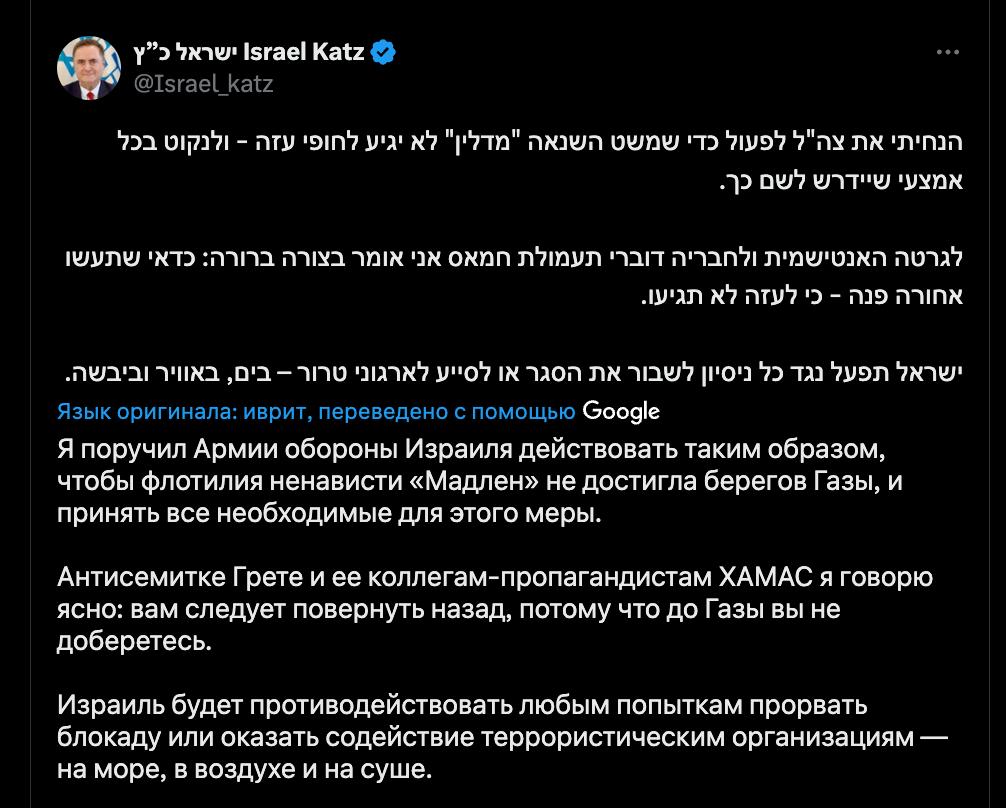 "Я поручил Армии обороны Израиля действовать таким образом, чтобы лодка ненависти "Мадлен" не достигла берегов Газы, и принять все необходимые для этого меры. Антисемитке Грете и её коллегам-пропагандистам ХАМАС я говорю ясно: вам следует повернуть назад, потому что до Газы вы не доберётесь. Израиль будет противодействовать любым попыткам прорвать блокаду", – написал Кац.