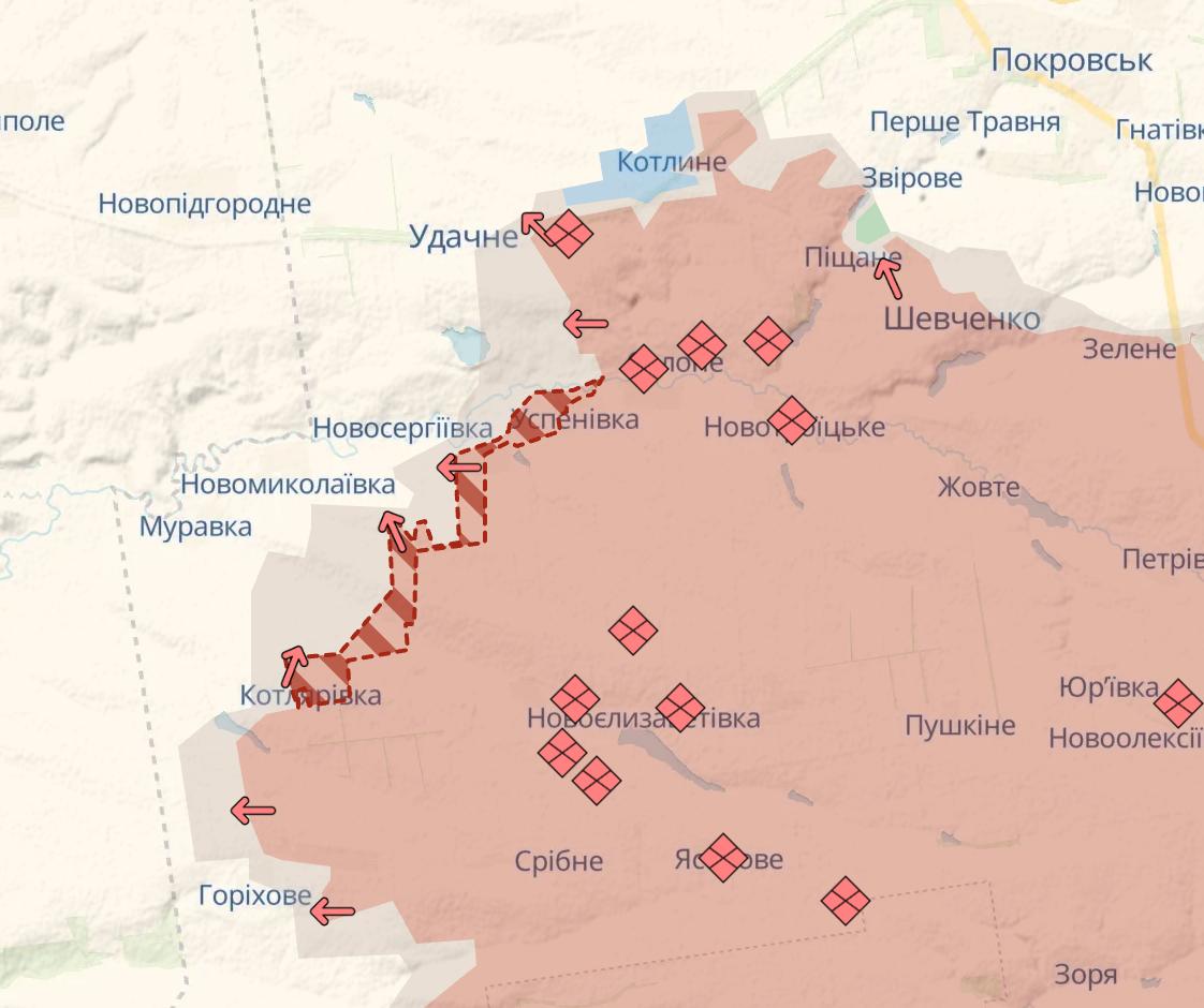 12.35 Армия РФ снова продвинулась у границы с Днепропетровской областью сразу на нескольких участках от Успеновки до Котляровки, свидетельствует карта Deep State.