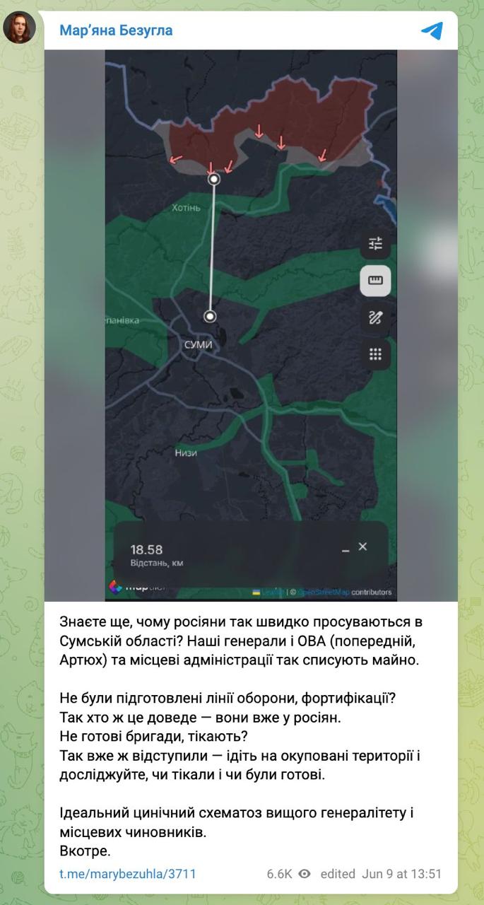 14.29 Нардеп Марьяна Безуглая намекает, что территории Сумской области "сдают" россиянам, чтобы прикрыть плохую подготовку к обороне.