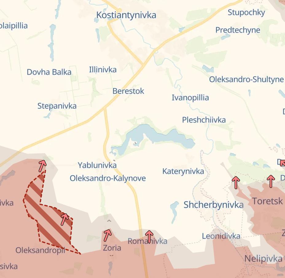 А именно - к югу от Константиновки, в районе села Яблоновка. Украинский боец с позывным "Мучной" пишет, что поля к югу от Яблоновки и соседнего с ней Александро-Калиново уже заняты россиянами. А логистика ВСУ севернее уничтожается дронами.
