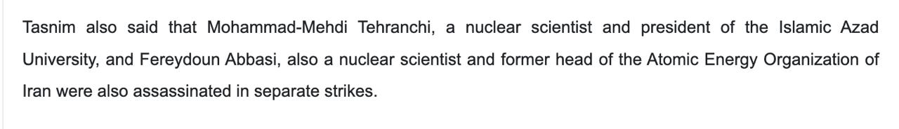 Также погибли два крупных ученых-ядерщика - Мохаммад-Мехди Тегеранчи и Ферейдун Аббаси, пишет иранское агентство Tansim.