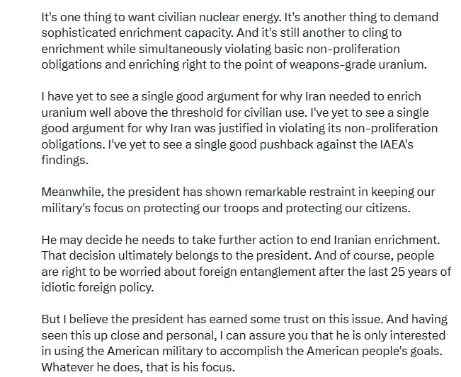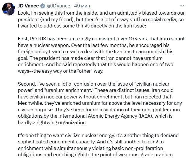 "Иран мог бы иметь мирную ядерную энергию без обогащения, но отказался. Иран обогатил уран до уровней, значительно превышающих те, которые необходимы для любых гражданских целей. Трамп может принять решение о принятии дополнительных мер по прекращению обогащения урана, и это решение в конечном итоге будет принимать он", – написал Вэнс в соцсети Х.