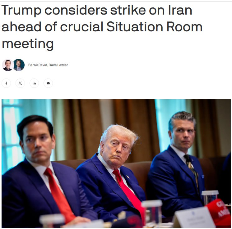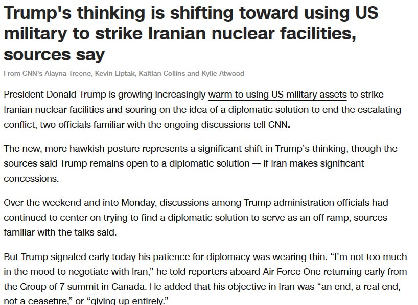 Американские официальные лица заявили изданию, что Трамп серьезно рассматривает возможность присоединения к войне и нанесения удара США по ядерным объектам Ирана, особенно по подземному заводу по обогащению урана в Фордо.