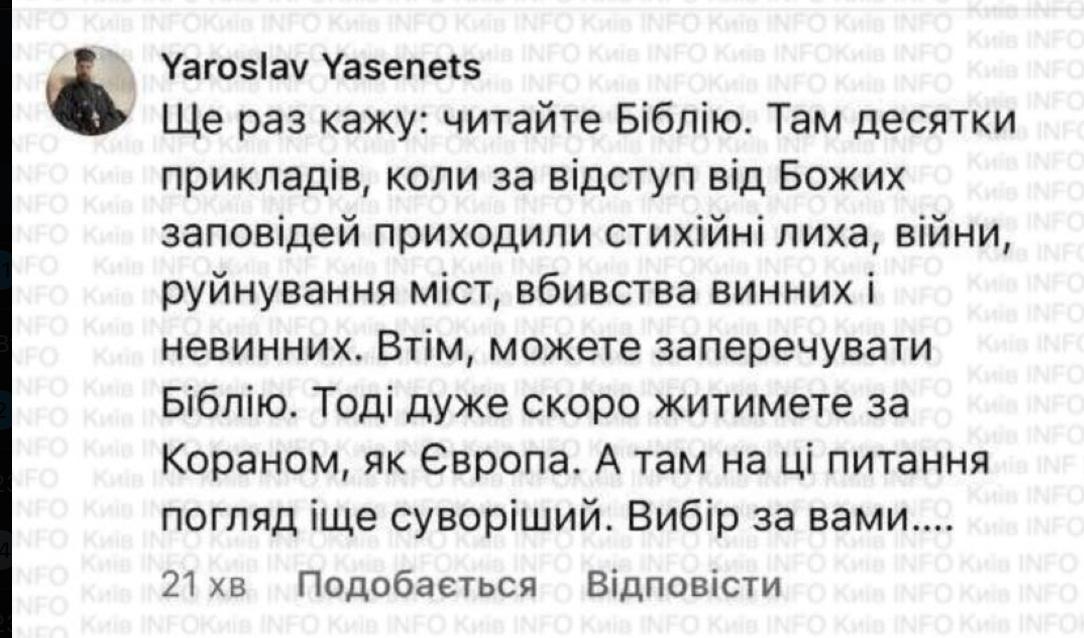 Священник ПЦУ Ярослав Ясенец связал ракетный удар по Киеву с прошедшим накануне маршем за права ЛГБТ.