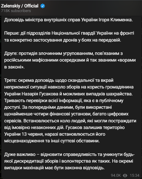 При этом ещё 13 июня, по словам президента Украины Владимира Зеленского, Назарий покинул территорию страны. Комментируя этот инцидент сегодня, Зеленский заявил, что данные о деятельности Гусакова проверяются, для чего задействованы как минимум четыре финансовых учреждения и несколько цифровых сервисов. Устанавливается круг лиц, которые могли пострадать от возможных неправомерных действий.