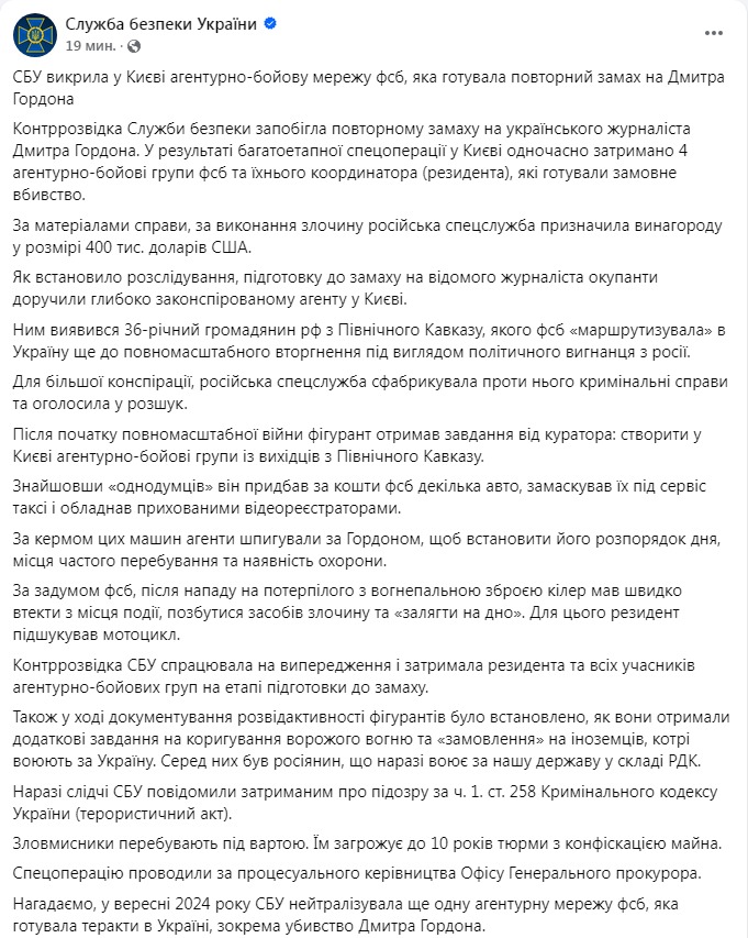 "В результате многоэтапной спецоперации в Киеве одновременно задержаны 4 агентурно-боевые группы ФСБ и их координатор (резидент), которые готовили заказное убийство. По материалам дела, за исполнение преступления российская спецслужба назначила вознаграждение в размере 400 тыс. долларов США. Как установило расследование, подготовку к покушению на известного журналиста была поручена глубоко законспирированному агенту в Киеве. Им оказался 36-летний гражданин России с Северного Кавказа, которого ФСБ "маршрутизировала" в Украину еще до полномасштабного вторжения под видом политического изгнанника из России. Для большей конспирации российская спецслужба сфабриковала против него уголовные дела и объявила в розыск", - сказано в публикации.