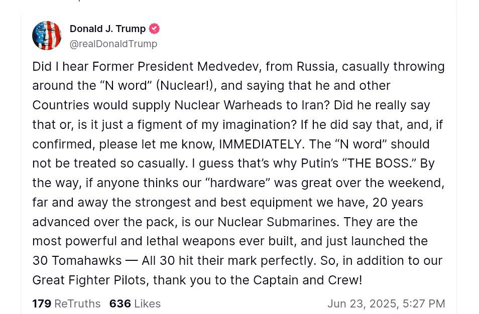 Напомним, после удара США по Ирану Медведев написал, что ряд стран готовы напрямую передать свой ядерный боекомплект Тегерану. При этом он не уточнил, является ли одной из таких стран Россия.