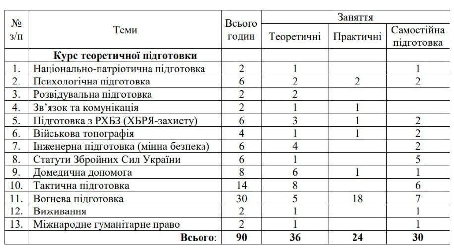 Основной акцент в теоретической части будет сделан на огневой подготовке - ей отводится 30 часов. Еще 14 часов посвятят тактической подготовке, 8 часов - домедицинской подготовке. По 6 часов будет уделено психологической подготовке студентов, защите от радиационной, химической и биологической угроз, минной безопасности и изучению уставов.