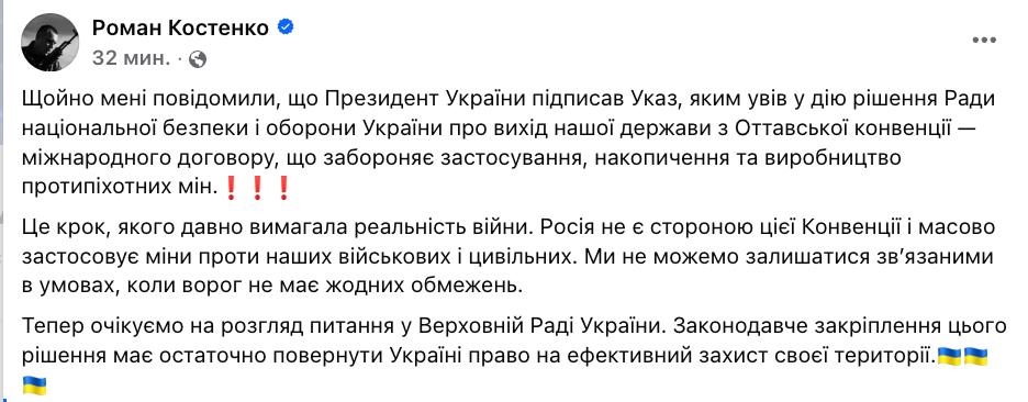 13:04 Президент Владимир Зеленский ввел в действие решение СНБО о выходе из Оттавской конвенции, которая запрещает производство и применение противопехотных мин.