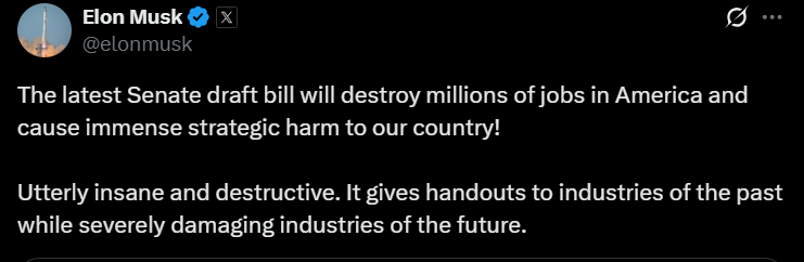 "Последний законопроект Сената уничтожит миллионы рабочих мест в Америке и нанесет огромный стратегический вред нашей стране!" - написал Маск в X.