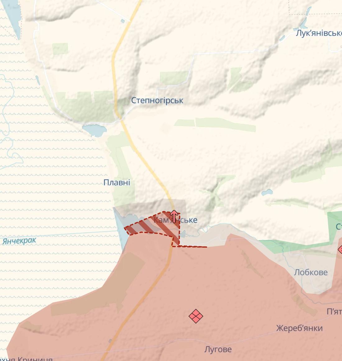 На карте украинского военного паблика указано существенное продвижение россиян в Каменском (кратчайшая дорога на Запорожье). По сути подтверждаются данные российских пабликов о заходе в это село на днях и выходу в его северную часть.