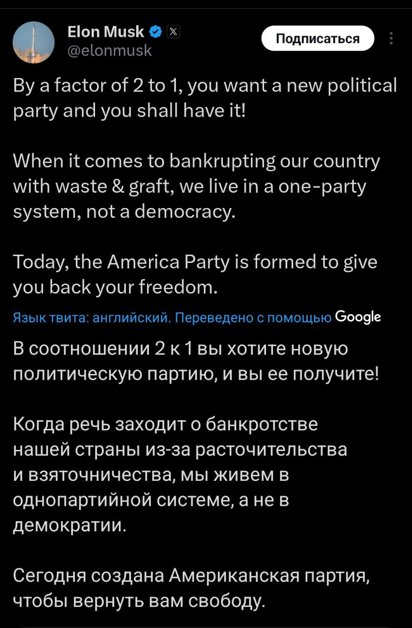 Сегодня создана Американская партия, чтобы вернуть вам свободу", - написал Маск.