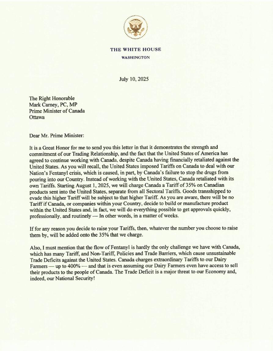 Reuters отмечает, что пошлина в размере 35% представляет собой повышение по сравнению с нынешней ставкой в 25%, которую Трамп назначил для Канады, и является ударом для Карни, который стремился заключить торговое соглашение с Вашингтоном.