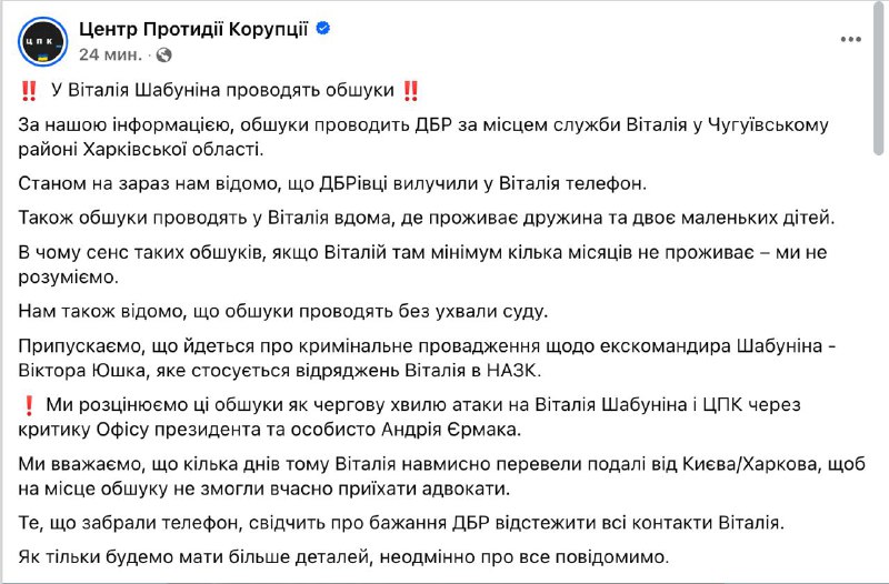 "Предполагаем, что речь идет об уголовном производстве в отношении экс-командира Шабунина Виктора Юшко, которое касается командировок Виталия в НАПК", - заявили в ЦПК. Но настоящую причину обысков там связывают с критикой со стороны Шабунина в адрес Офиса президента и лично Андрея Ермака.