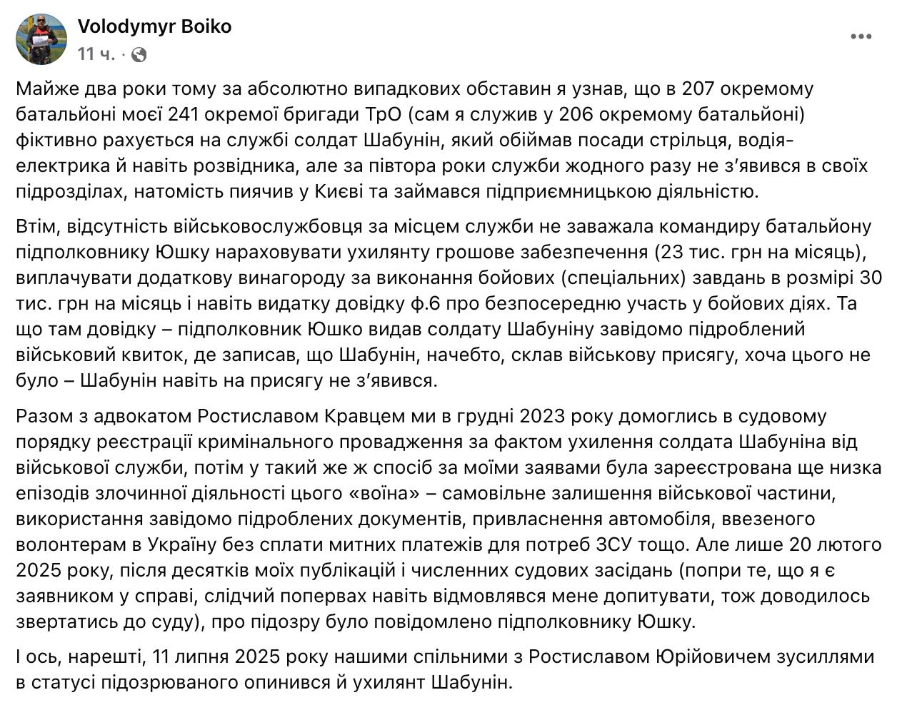 Почти два года назад Бойко, как он заявляет, случайно узнал, что в 207 отдельном батальоне 241 отдельной бригады ТРО (он сам служил в 206-м той же бригады) числится солдат Шабунин.