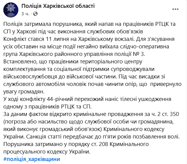 По данным полиции, представители ТЦК сопровождали военнослужащего в часть. Во время высадки из служебного автомобиля возник конфликт, который привлек внимание прохожих. Один из них нанес телесные повреждения военкому.