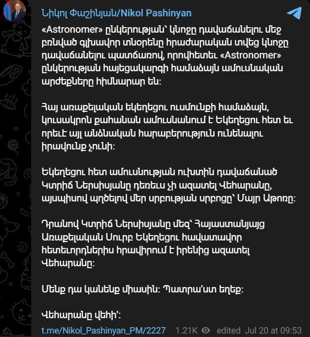 Напомним, у премьера острый конфликт с Армянской апостольской церковью, которая критикует премьер-министра Армении за уступки Азербайджану и Турции. Жена премьера Анна Акопян назвала духовенство "главными педофилами страны". В ответ ААЦ обвинила власти в целенаправленной кампании по дискредитации церкви, назвав позицию премьера враждебной и опасной для единства общества.