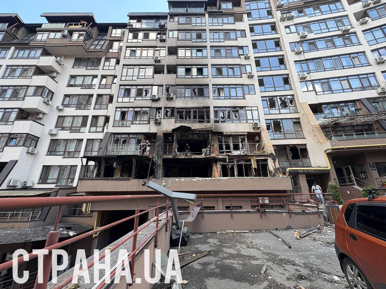 По словам местных жителей, в этот раз упали обломки. Полностью выгорели два этажа, где находились коммерческие помещения и жилые квартиры. Повреждены ещё три этажа и автомобили во дворе.