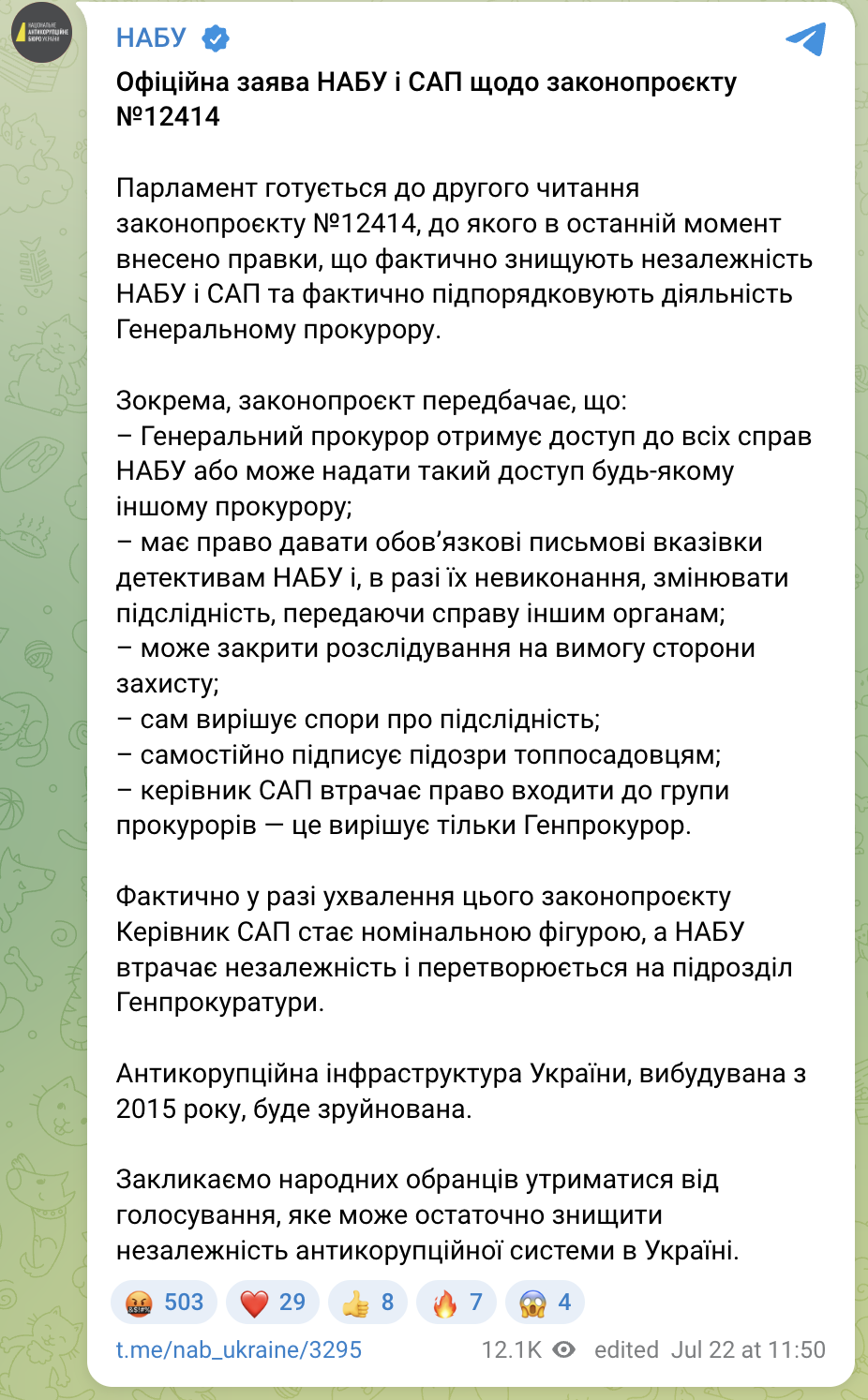 Позже НАБУ и САП опубликовали официальный комментарий с критикой законопроекта, который "может уничтожить независимость антикоррупционной системы в Украине".