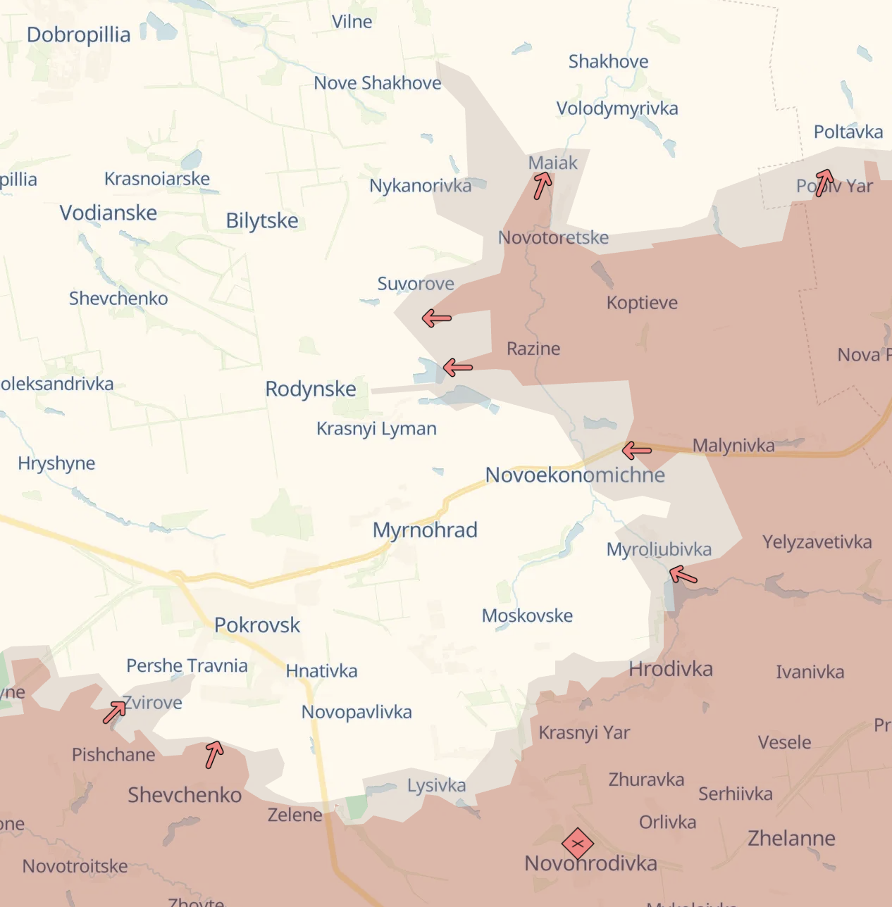 На участке Родинское – Красный Лиман севернее Покровска и Мирнограда наступление осуществляется малыми группами через поля и лесополосы. Основные боестолкновения — на восточных подступах к промзоне Родинского. Также отмечается продвижение с северо-востока в направлении тыловых позиций.