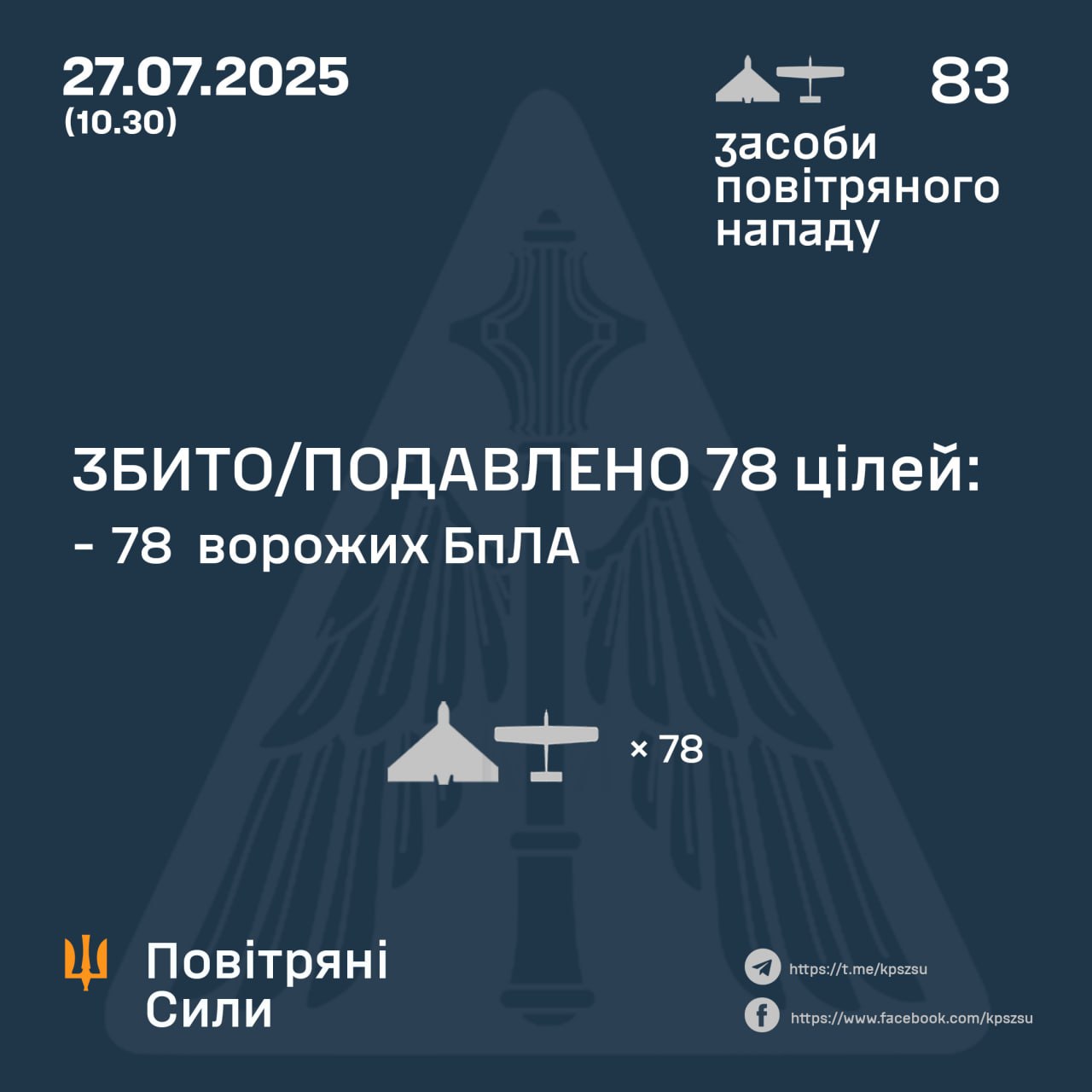 10:42 Сегодня россияне атаковали Украину 83 ударными БпЛА типа Shahed и беспилотниками-имитаторами, сообщаю Воздушные силы ВСУ.