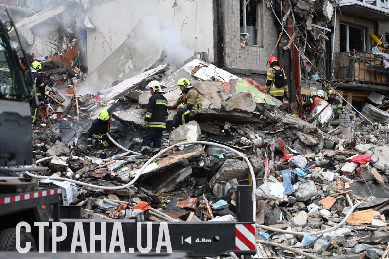 9.07 В обрушившейся части жилого дома в Киеве на нижних этажах всё ещё остаются заблокированные люди. Сейчас спасатели пытаются достать их из-под завалов.