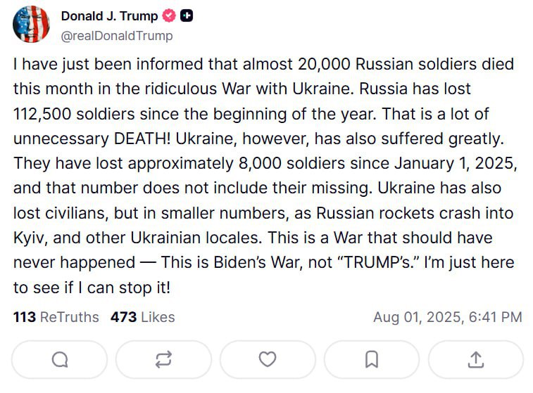 "С начала года Россия потеряла 112 500 военнослужащих. Это слишком много ненужных смертей! Однако Украина также понесла серьёзные потери. С 1 января 2025 года она потеряла примерно 8 000 солдат, и это число не включает пропавших без вести. Украина также потеряла и гражданских, но в меньшем количестве – когда российские ракеты падают на Киев и другие украинские города. Это война, которой никогда не должно было быть – это война Байдена, а не Трампа. Я здесь только для того, чтобы попытаться её остановить", – написал глава Белого дома.