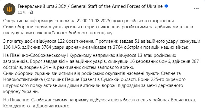 "На Северо-Слобожанском и Курском направлениях произошло 13 атак российских захватчиков. Враг нанес восемь авиационных ударов, сбросив 16 управляемых бомб, совершил 287 обстрелов, в том числе 24 – из реактивных систем залпового огня. Силы обороны Украины зачистили от российских оккупантов населенные пункты Степное и Новоконстантиновка (бывшее Первое Мая) в Сумской области. Воины 225-го отдельного штурмового полка активными действиями вытеснили вражеские подразделения за пределы государственной границы Украины", - говорится в сводке.