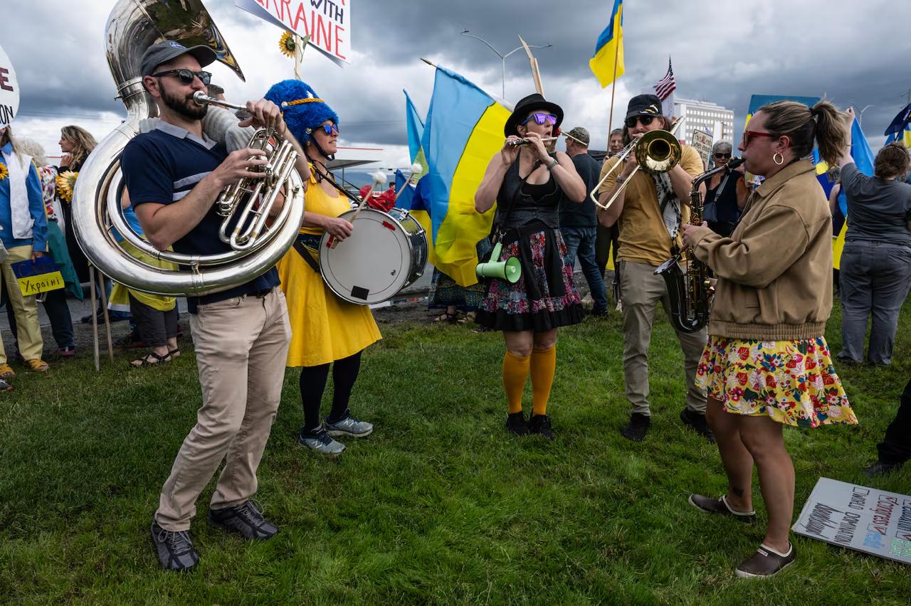На митинг вышли в основном живущие на Аляске американцы, которые выступают не только за Украину, но и против политики Трампа целом.