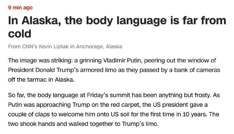 "До сих пор язык тела на саммите в пятницу был далёк от холодности. Когда Путин подходил к Трампу по красной ковровой дорожке, президент США сделал несколько хлопков в ладоши, приветствуя его на американской земле впервые за последние 10 лет. Они пожали друг другу руки и вместе направились к лимузину Трампа", - пишет телеканал.