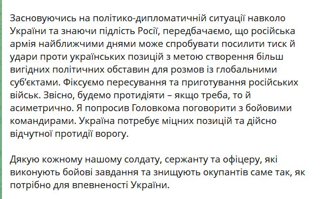Также Зеленский по итогам встречи с главкомом ВСУ Александром Сырским сообщил, что российская армия в ближайшие дни может попытаться активизировать наступательные действия "с целью создания более выгодных политических обстоятельств для разговоров с глобальными субъектами".
