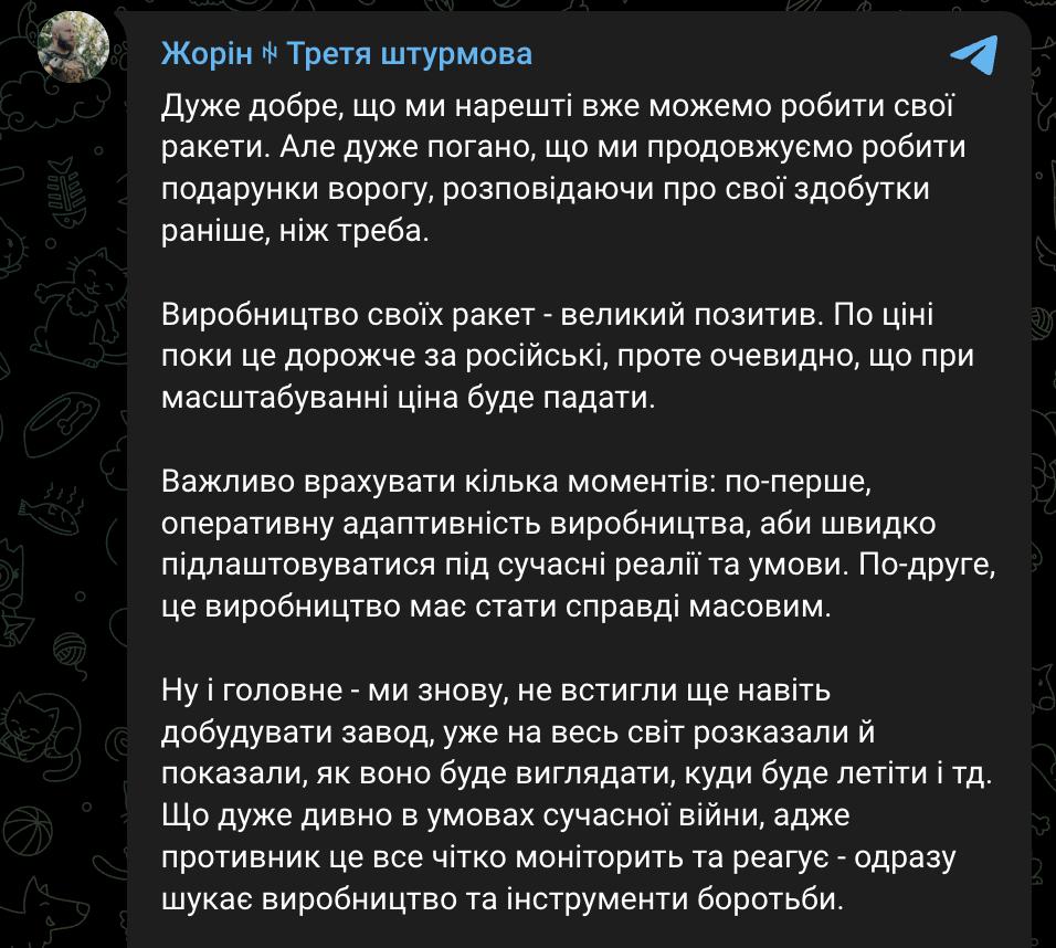 "Мы снова, еще не успели достроить завод, уже на весь мир рассказали и показали, как это будет выглядеть, куда будет лететь и так далее. Что очень странно в условиях современной войны, ведь противник всё это тщательно отслеживает и реагирует - сразу ищет производство и инструменты для противодействия", - написал представитель 3-й штурмовой бригады Максим Жорин.
