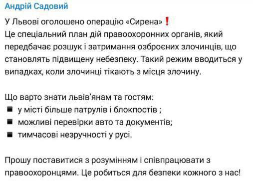 Мэр города Андрей Садовой заявил, что в ходе операции "Сирена" во Львове останавливают автомобили для досмотра и проверки документов. В городе продолжает действовать план "перехват" из-за убийства Парубия.